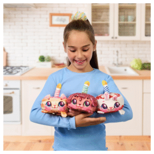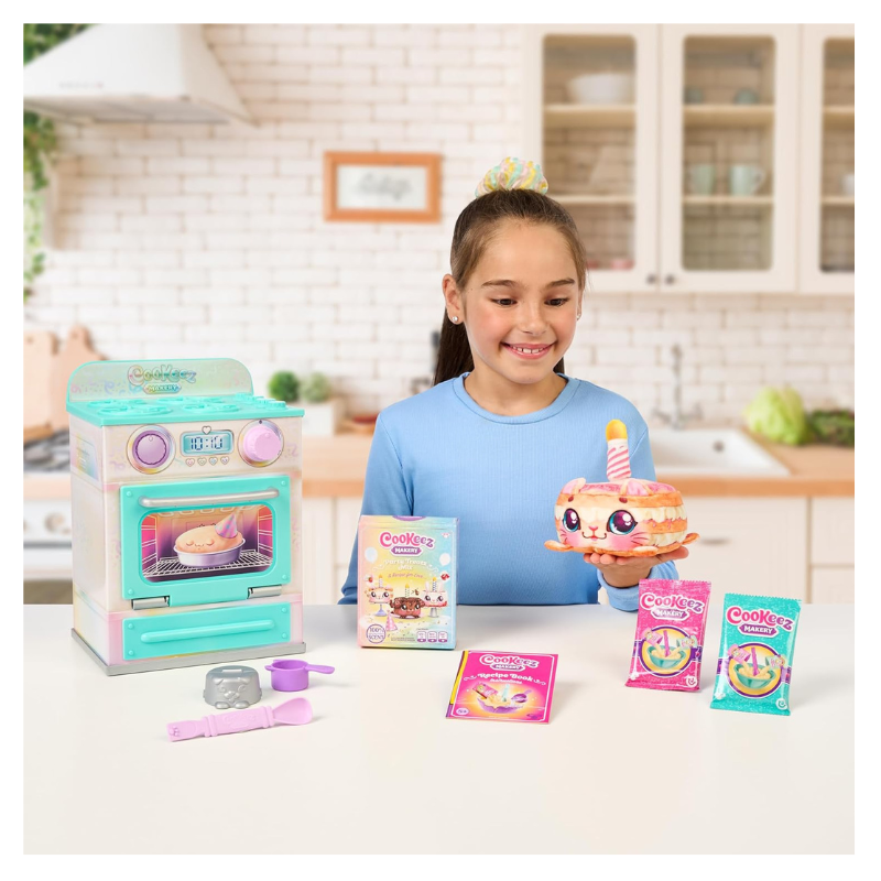 Welcome to the Cookeez Makery, where sweet surprises are baked with love! The Party Treats Oven Playset lets kids mix, “bake”, and reveal an adorable scented plush pet that comes out warm and cuddly — just like a real baked treat! Watch the magic happen as your child mixes the ingredients, places the dough into the oven, and discovers which surprise pet they’ve made.