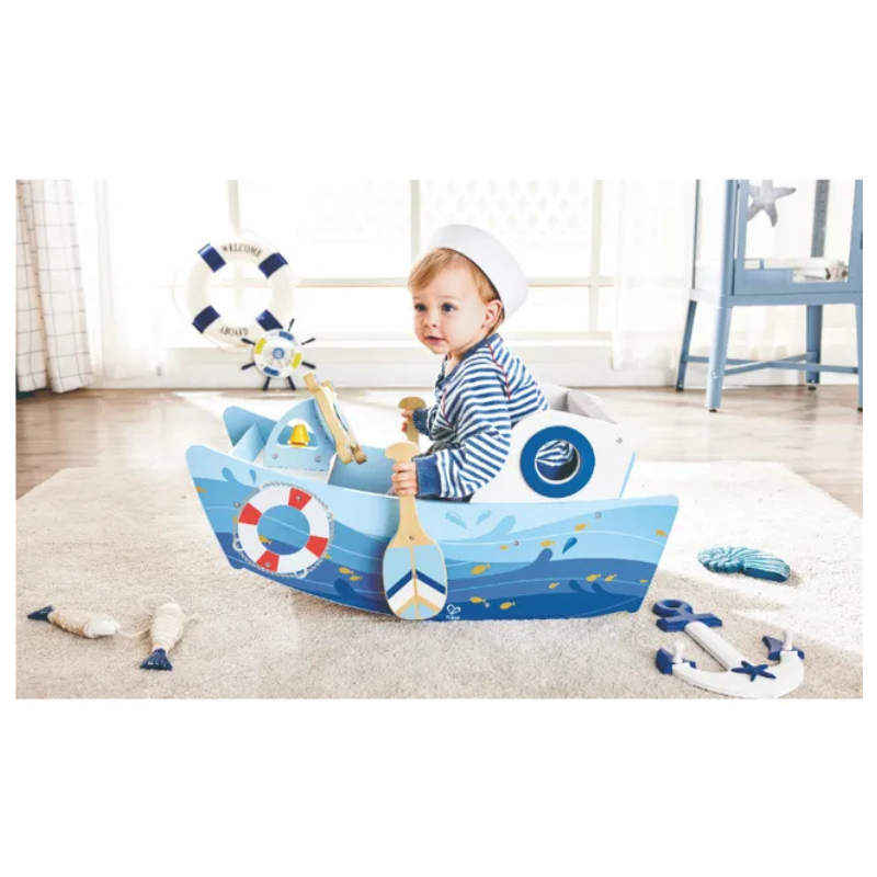 Set sail on endless imaginative adventures with Hape’s interactive toy boat. Features oars, a steering wheel, and a hook for a captivating playtime experience. Cast off from shore to teeter and totter on the ocean waves! Drift across the deep blue and rock worries away aboard this tugboat. This nautically inspired teeter-totter is perfect for the little explorer in your life.