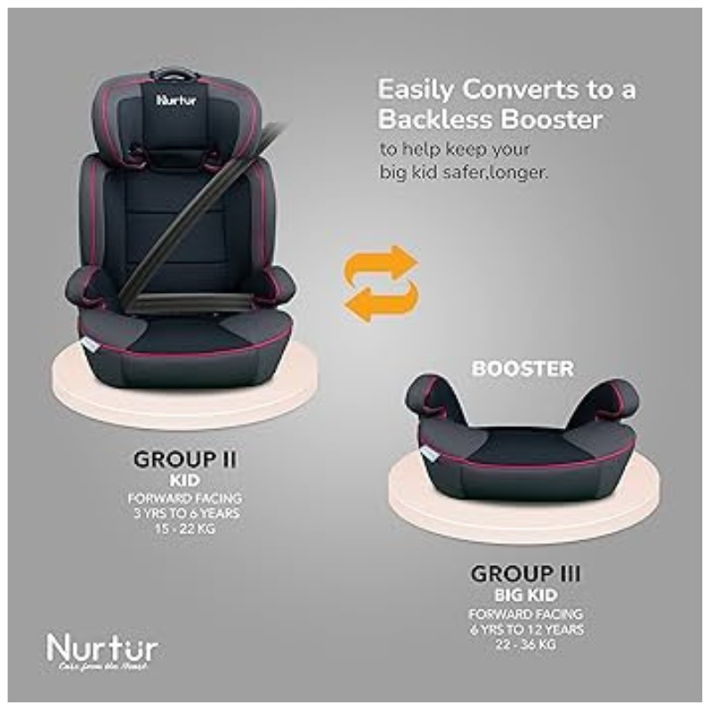 - CONVERTIBLE CAR SEAT: Isn’t it great that you just need to buy one car seat for your child? The Nurtur Jupitar car seat converts to a booster seat with ease. Simply snap the car seat, remove the belts and you’re done! A beautiful new booster seat. You may use the car seat of your child’s favorite character for as long as you like. No need to buy an additional booster seat!