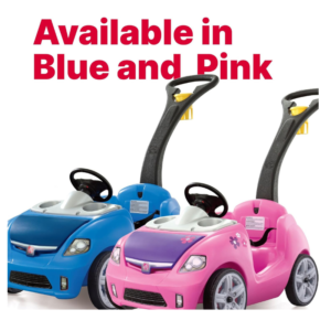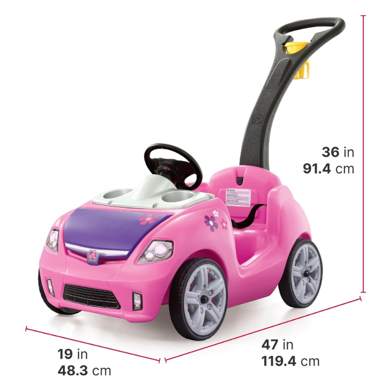 Take this stylish kids’ toy push car out for a stroll with your little one! They’ll have a blast in the Step2 Whisper Ride II pretending to drive their very own supercar with the movable steering wheel and realistic horn. Buckle up with the included seat belt, pack some snacks in the under-hood storage, and use the cup holders for drinks. This ride-on car features Whisper Wheels for reduced road noise, along with an easy-fold handle for effortless transportation and storage wherever the next adventure leads. Redesigned from our classic Whisper Ride Cruiser model, the Whisper Ride II has a larger interior so toddlers can travel in style and comfort. Made in USA of US and imported parts.
